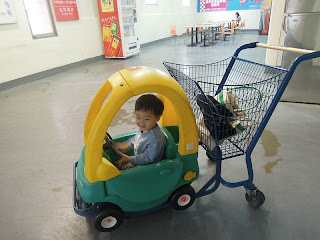 當把鼻停車的時候,媽咪眼尖發現這台有小汽車的推車,立刻叫把鼻去拿!這次Aaron總算可以開到爽啦!還記得在澳洲outlet,Aaron看著這種推車好久,剛好遇到一位大方的姊姊,借Aaron坐,雖然姊姊很棒的說Aaron可以多坐一下,不過礙於集合時間,Aaron只能稍微坐一下!這回在這邊居然讓我們遇到了!Aaron整個好開心!笑得合不容嘴!因為美夢成真囉! |